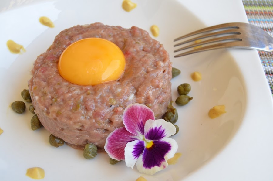 Emplatamos poniendo con un ARO PARA EMPLATAR la carne, alrededor ponemos las alcaparras con unos puntos de mostaza y coronamos con la yema de huevo.