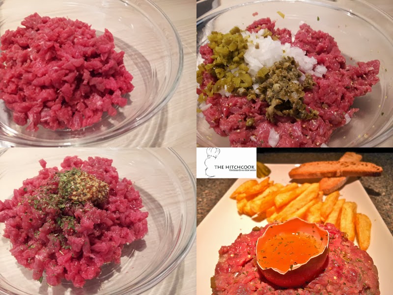 Es primordial (casi purista) que la carne de ternera o buey esté de una pieza. Con paciencia y un buen cuchillo debemos ir quitando los nervios, telillas y demás impurezas. Luego lo picamos bien. Es trabajoso pero un buen juego de muñeca (y mucho ojo) tenemos el resultado idóneo.