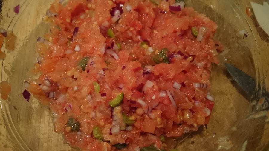 En un bol amplio vertemos el tomate y añadimos la cebolla morada muy picadita, los pepinillos también picados y las alcaparras.
