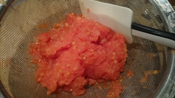 Rallamos los tomates de forma gruesa (tiene que notar su textura, no quedar demasiado una masa demasiado pastosa). Colocamos un colador sobre un bol y procedemos, de esa manera conseguiremos ir eliminando la mayor cantidad de líquido posible. Aplastadlo con cuidado para que "sude".