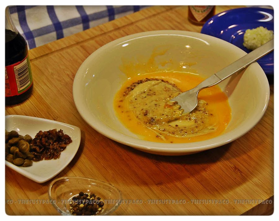 ~ Preparar en un plato mayonesa con la yema de huevo, aceite y cuando ligue añadir la mostaza
