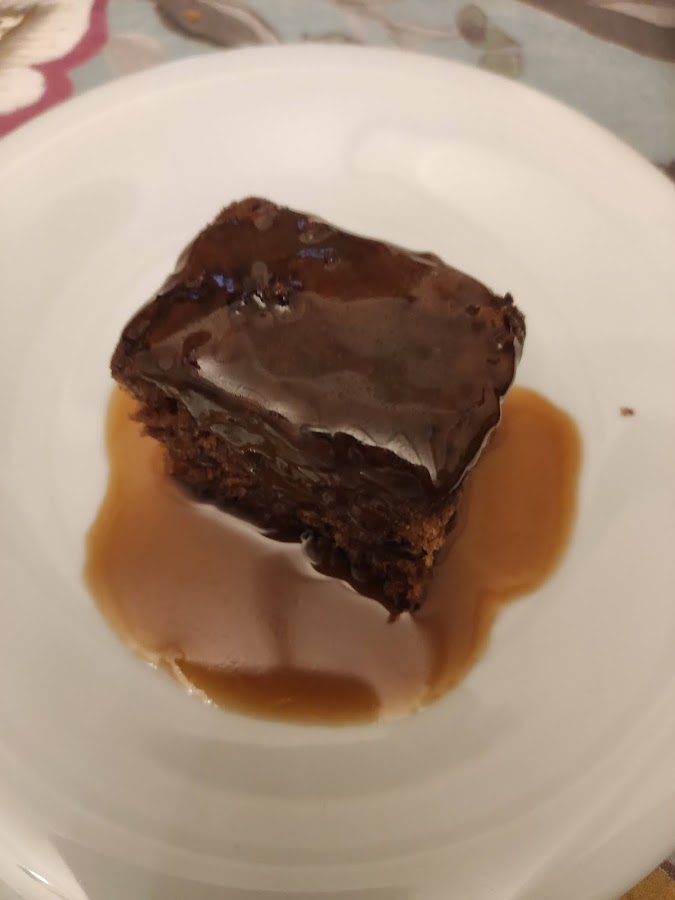 Mientras vamos haciendo la salsa. Ponemos el azúcar, la mantequilla y la nata (crema de leche) en una sartén o cazo a fuego lento hasta que el azúcar se haya disuelto por completo. Damos vueltas con una cuchara de madera hasta que la salsa adquiera un bonito color de caramelo. Cortamos el pastel en cuadraditos y servimos con la salsa templada y si se quiere un poco de helado de vainilla.