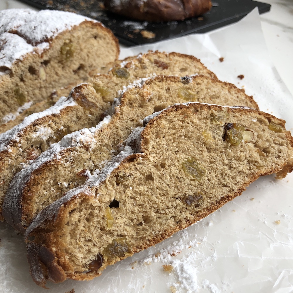 Disolver en un bol la levadura en la leche tibia y agregar los 25 gs de harina. Mezclar hasta integrar y tapar con papel film. Dejar que duplique el tamaño.Colocar en la batidora con el gancho amasador los 150 gs de harina, el azúcar, los huevos, la ralladura, la canela y la esencia de vainilla. Comenzar a amasar y una vez que se comience a formar una pasta, agregar la masa de levadura que estaba leudando. Agregar la manteca pomada en 2 veces y continuar amasando por 7 minutos hasta que se haya formado un bollo que se desprenda de las paredes de la máquina. Agregar un poco de harina de ser necesario y retirar de la batidora. Dejar reposar la masa por 15 minutos bien cubierta con un nylon o repasador.Aplanar la masa en una mesada apenas enharinada y volcar encima la fruta. Presionar la misma contra la masa y plegarla algunas veces para que toda la fruta se integre muy bien. Dejar leudar por unos 20 minutos.Estirar en forma de rectángulo y desde la parte más ancha dividir la masa imaginariamente en 4 partes. Comenzar plegando la parte superior que llamaremos 1 sobre 2 y 4 sobre 3. Luego volvemos a plegar la parte superior sobre la inferior pero sin superponer y dejando un margen de un dedo aproximadamente Llevar a una placa apenas enharinada. Tapar y dejar duplicar su volumen.Pintar la superficie con el huevo batido.Hornear a 180°C por 15 a 17 minutos. Una vez tibio o frío espolvorear la superficie con el azúcar impalpable. Listo! A disfrutar!