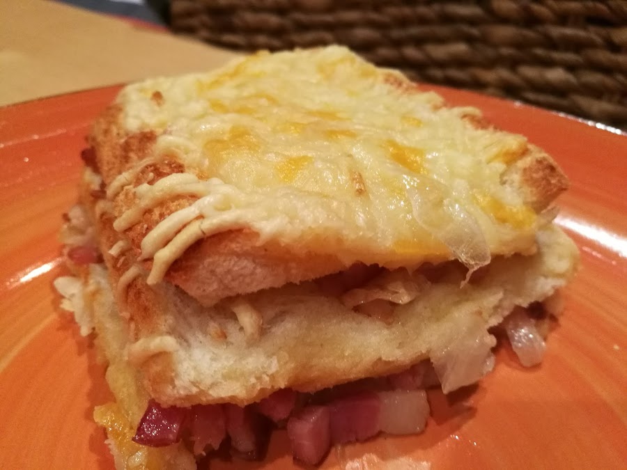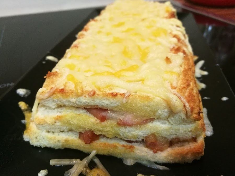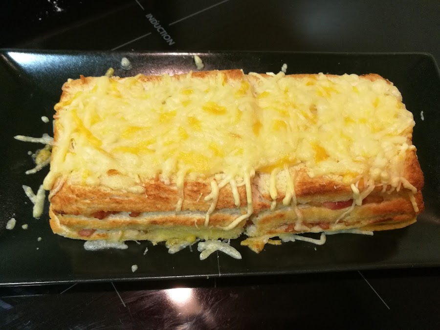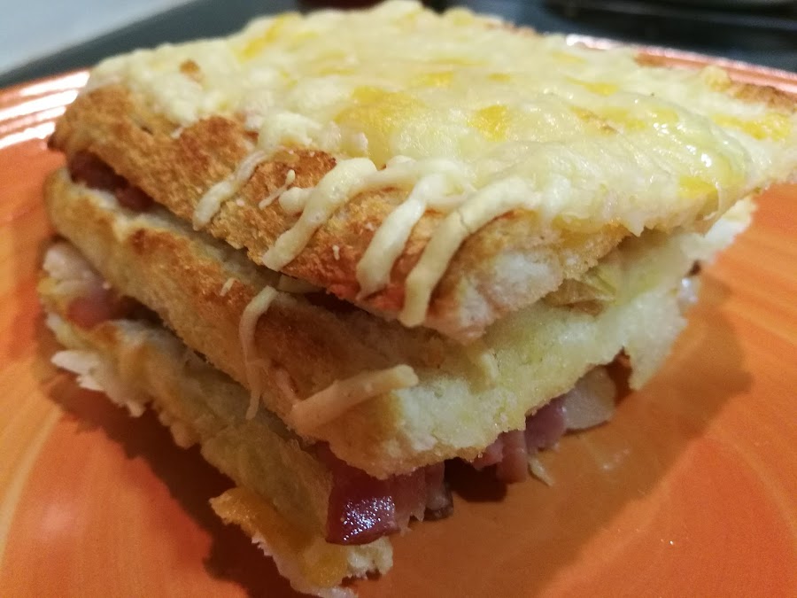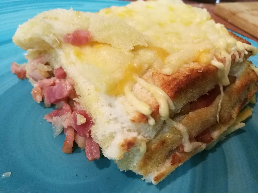- Encima ponemos la mezcla de bacon y cebolla, y así vamos haciendo capas hasta acabar con pan.
