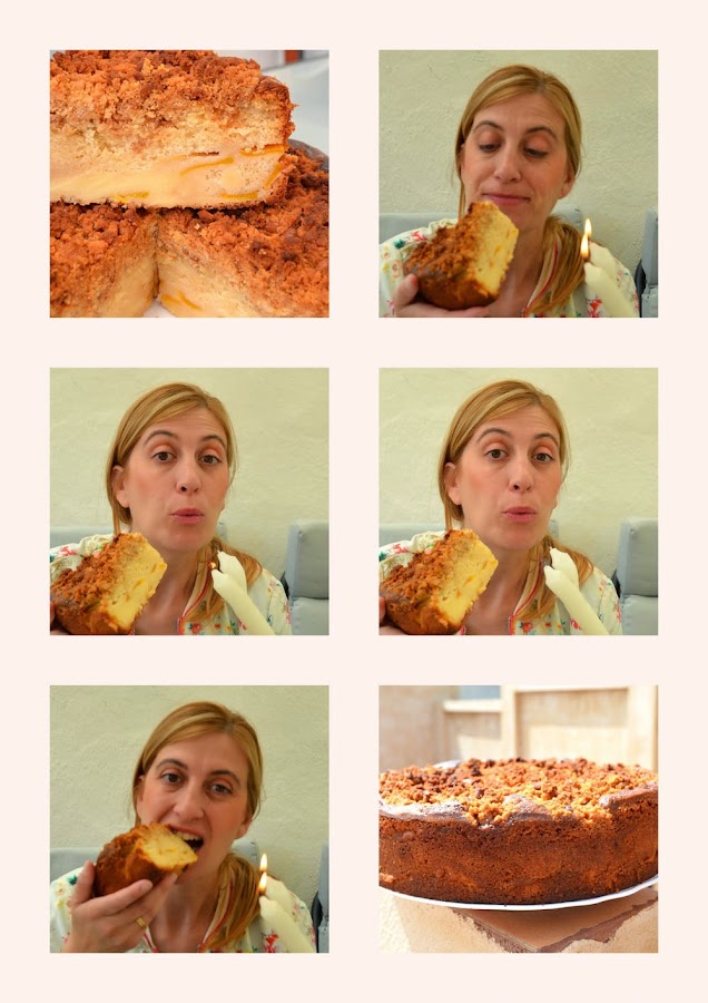 Después de mirar por la red y ver la cantidad de versiones que tiene esta tarta me decidí por hacer un bizcocho relleno de melocotón y crema pastelera y para los grumos, un desmigado de galletas. Lo llevé al pueblo para celebrar la fiesta de San Miguel y tenía que llevar galletas sí o sí, a mi hermana le chiflan.