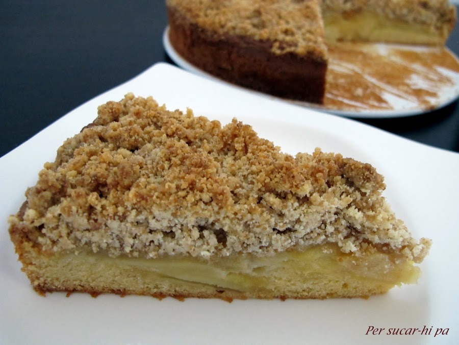 En la versión que os presentamos hemos elegido un bizcocho con relleno de manzana y almendra en la cobertura. Es curioso, y agradable, el contraste de texturas del interior, más húmedo y jugoso, y el efecto seco y crocante del streusel.