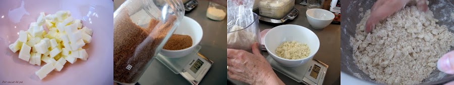 En un bol colocar la harina, la almendra molida, el azúcar y la mantequilla y mezclar, primero con una espátula o cuchara de madera, y después con las manos, para ir desmenuzando los terrones que se forman hasta que queden de tamaño reducido. Reservar en la nevera.