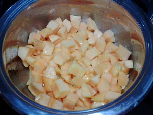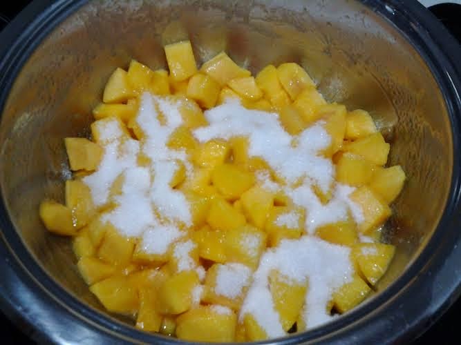 Por otra parte, ponemos una cazuela al fuego con la mantequilla. Cuando se derrita echamos los melocotones, removemos bien y cocinamos unos 10 minutos a fuego medio.
