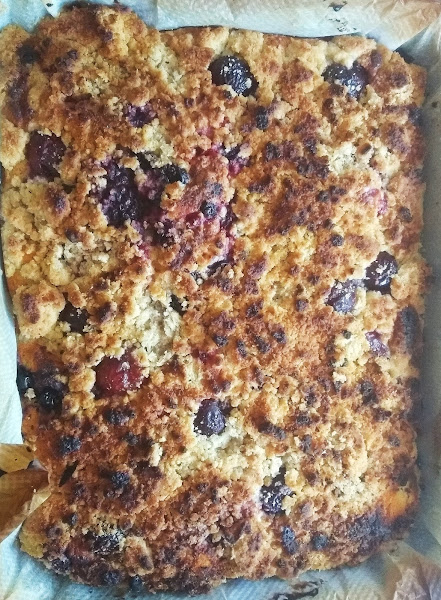 Es un bizcocho muy jugoso, con un rico sabor a mantequilla. Contrasta el crujiente de las migas con el ácido de las frutas. Paula no pudo esperar a que enfriara para empezar a comer jajaja.