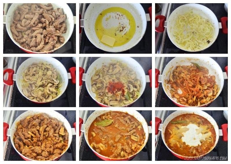 Como te comento en los ingredientes no solo puedes usar distintos tipos de corte de carne de vacuno sino también puedes hacer esta misma receta con distinto tipos de carnes. Verás muchos tipos de recetas para hacer un stroganoff, la verdad encontrar una receta original al 100% es realmente complicado, usar nata (crema de leche) por ejemplo es una adaptación de la crema agria, aunque en su origen debió ser al revés, es decir, al ir a Francia desde Rusia es normal que se aprenda a usar la nata (crema de leche), ingrediente muy francés desde tiempo inmemoriales, pero al volver a Rusia, lo más normal es usar crema agria, ingrediente ruso de siempre también, así que al parecer en este caso igual da que da lo mismo, tú decides.