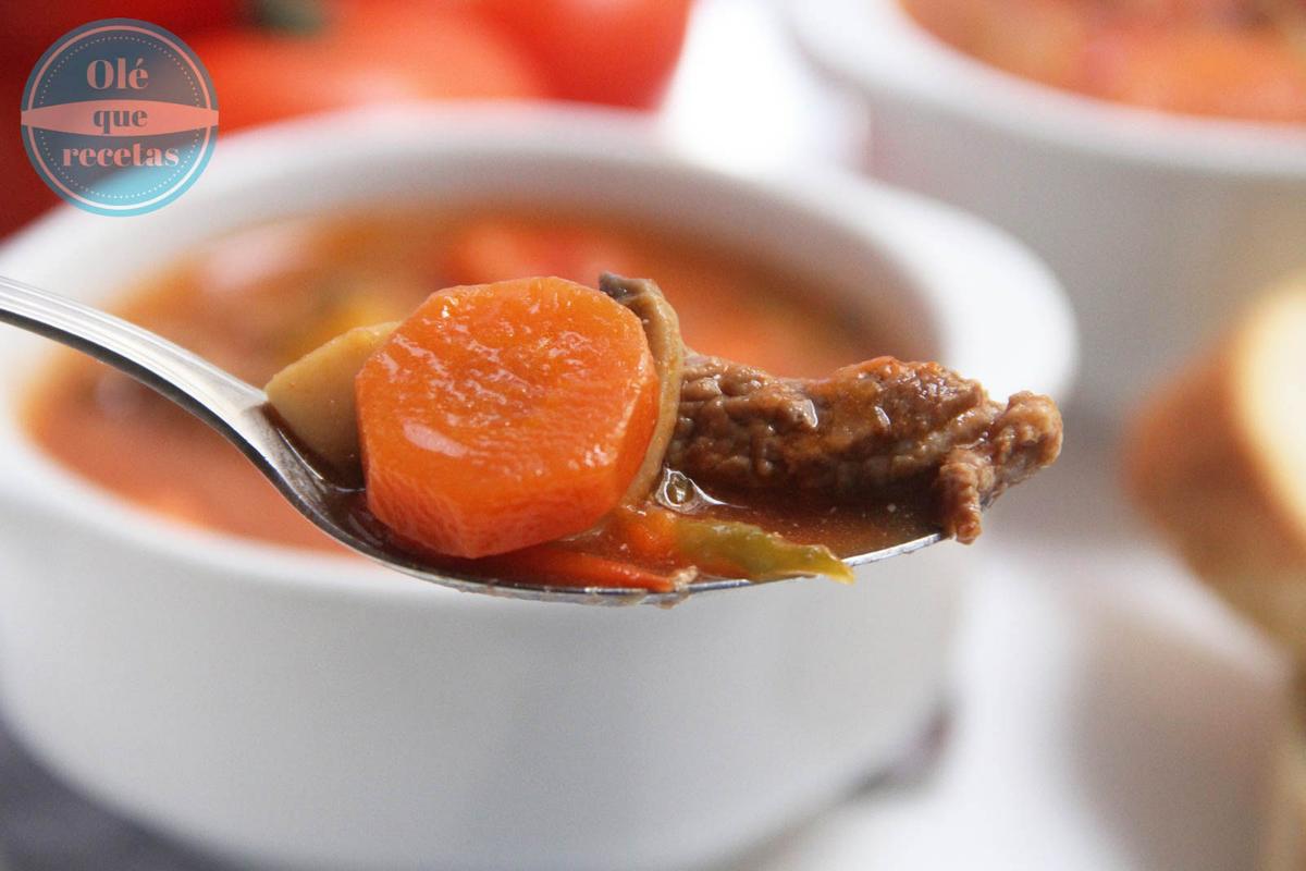Añadimos el caldo de carne (tiene que cubrir la carne y las verduras), sal, pimienta, hojas de laurel, chile rayado, pimentón dulce. Y cocinamos todos más o menos 1 hora a fuego medio.