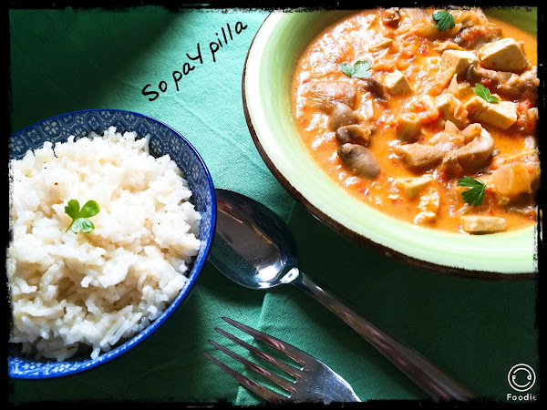 - Salteamos el arroz con la pimienta unos minutos, y lo servimos a parte para que cada uno se ponga la cantidad de arroz que quiera, la verdad es que con la salsita el arroz es imprescindible y está buenísimo!