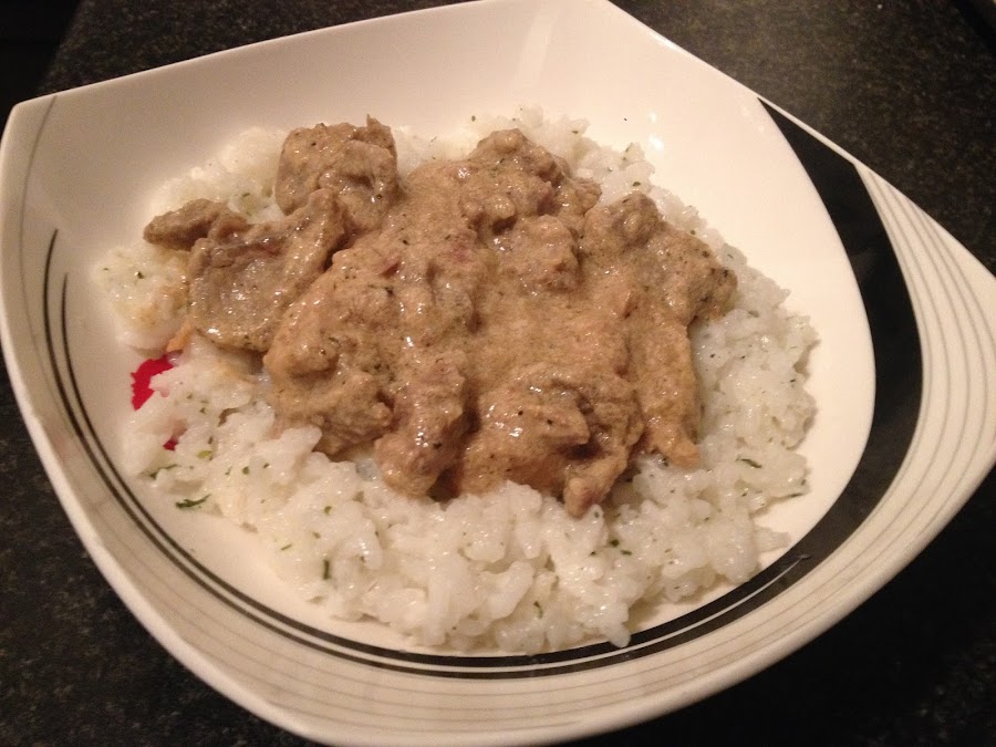 1º - Cortamos la carne en tiras finas y picamos la cebolla y el chalote . El arroz sirve de acompañante en la mayoria de las recetas de carne en la Europa del Este , así que podemos ir cociendo el arroz en una cazuela con agua y sal al gusto , y una vez esté listo lo reservamos .