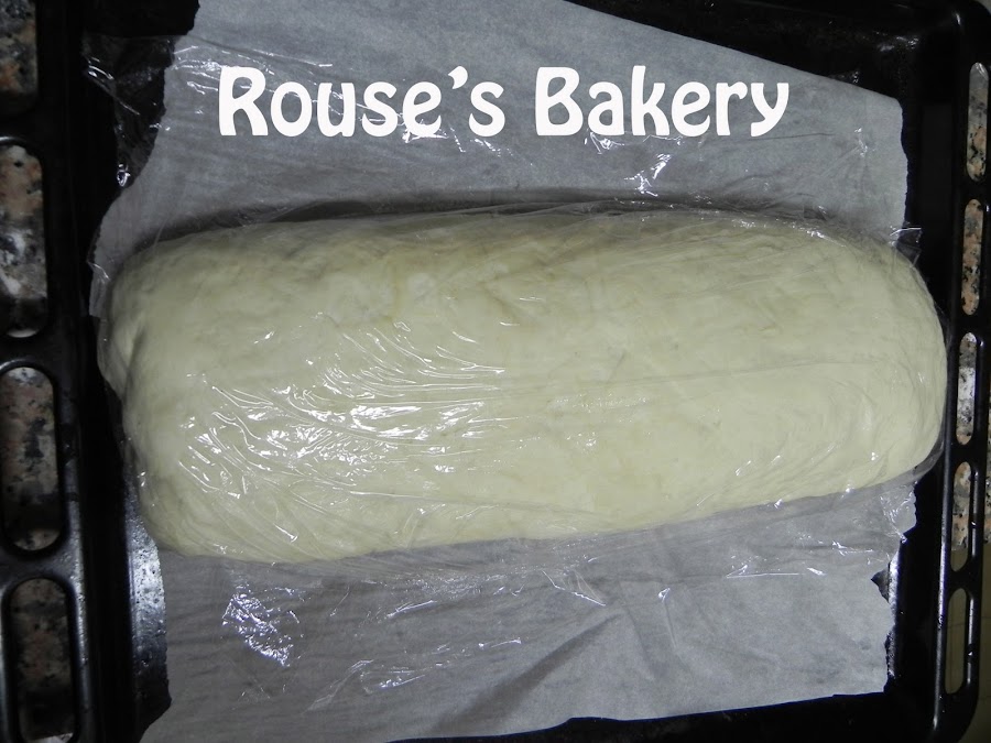 Preparamos una bandeja de horno con papel vegetal. Empezando por uno de los lados largos, enrollamos la masa, sellamos los extremos y lo colocamos de forma que se quede el borde del final del rollo en la parte de debajo. Tapamos la masa con film y la dejamos reposar 10 minutos.