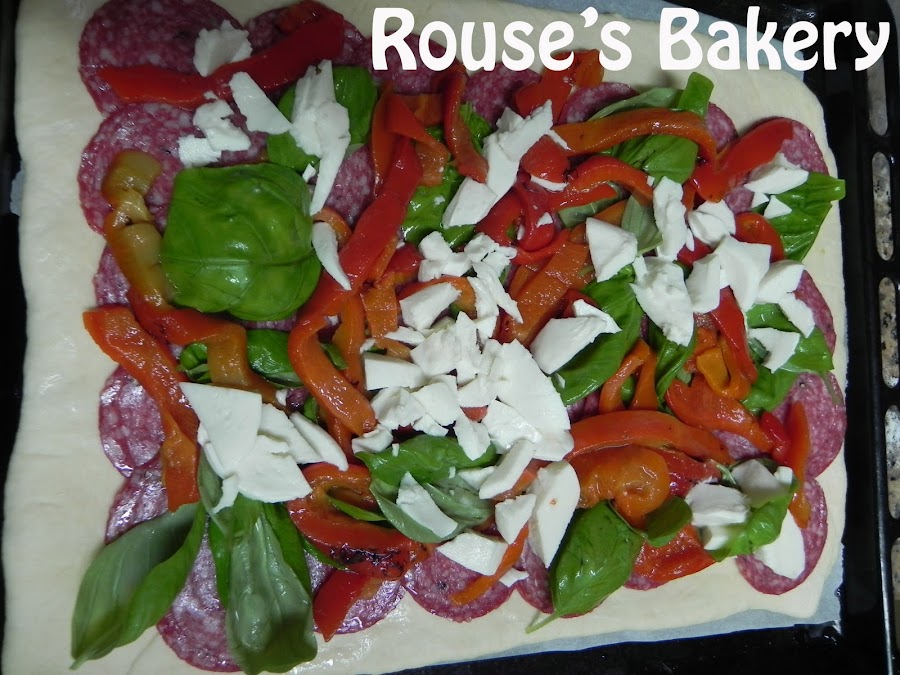 Picamos la mozzarella en daditos, los pimientos en tiras y los vamos distribuyendo por la masa junto a la albahaca. Sazonamos todo con pimienta negra.
