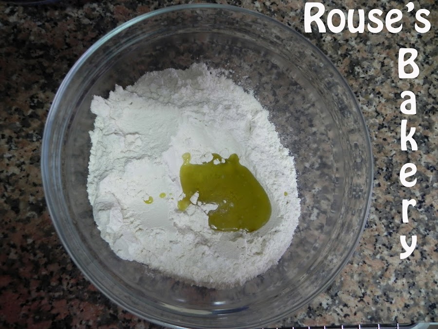 Ponemos en un bol la harina, la levadura y la sal. Añadimos el aceite y un tercio de la cantidad de agua.