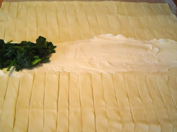 En el centro echamos la mitad del queso crema, por encima las espinacas