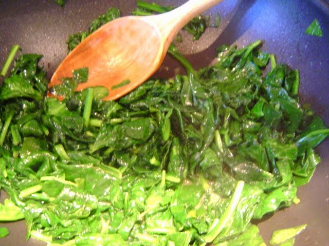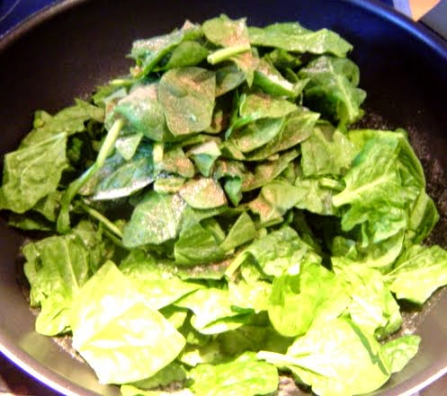Empezamos por freír las hojas de espinacas, en una sartén bien caliente,