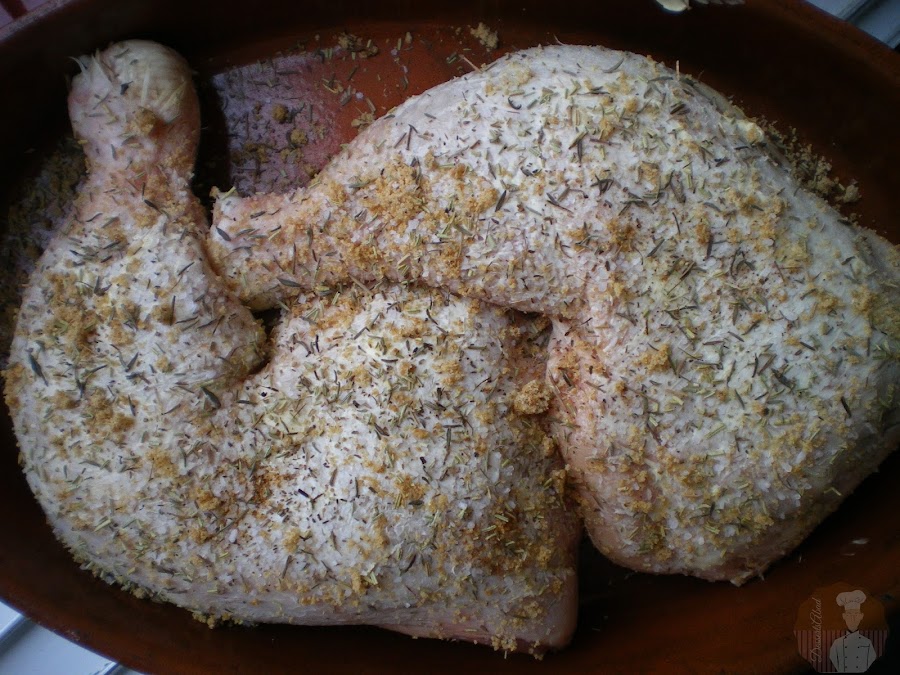 Machacar en un mortero una pastilla de caldo de pollo junto a unas ramitas de romero, tomillo y aceite de oliva. Espolvorear esta mezcla sobre los contramuslos y hornear a 180ºC durante 40 minutos aproximadamente y queden medianamente dorados. hay que tener en cuenta que luego van a recibir más calor.