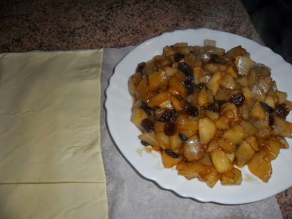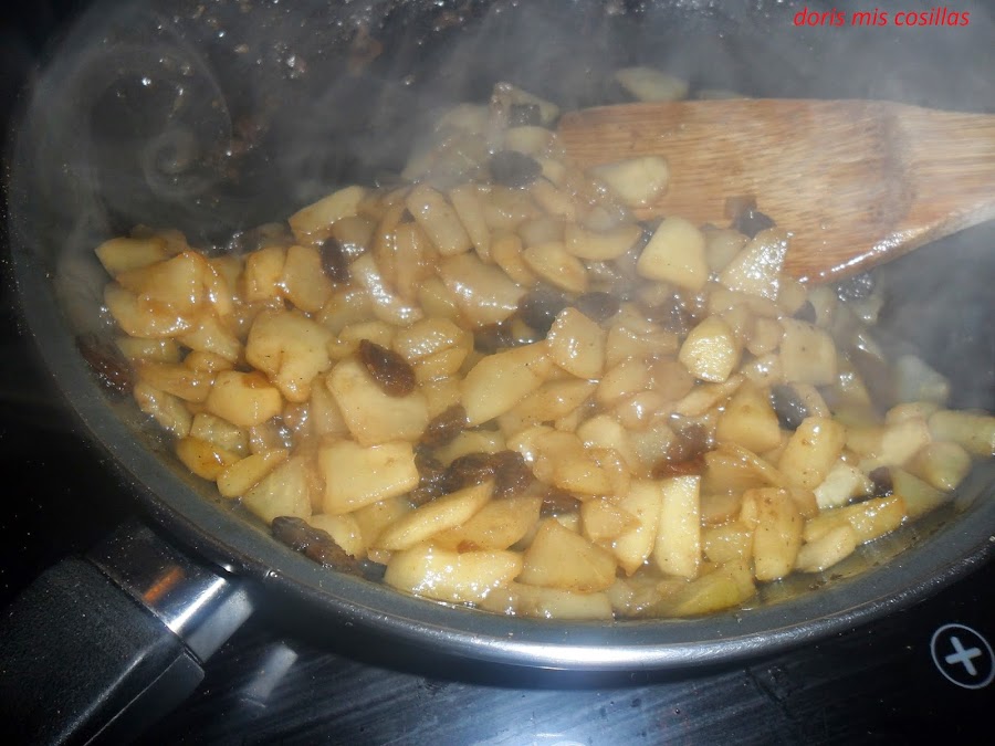 En una sartén al fuego lento, poner la mantequilla y agregamos las manzanas fileteadas,el azúcar, canela al gusto y las pasas escurridas.