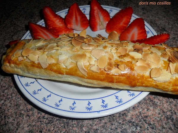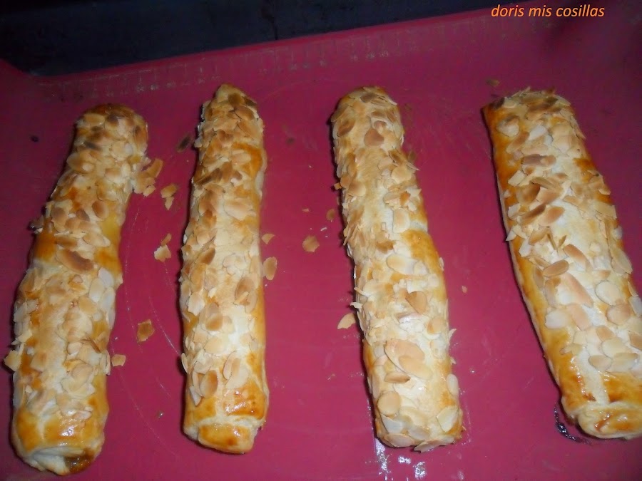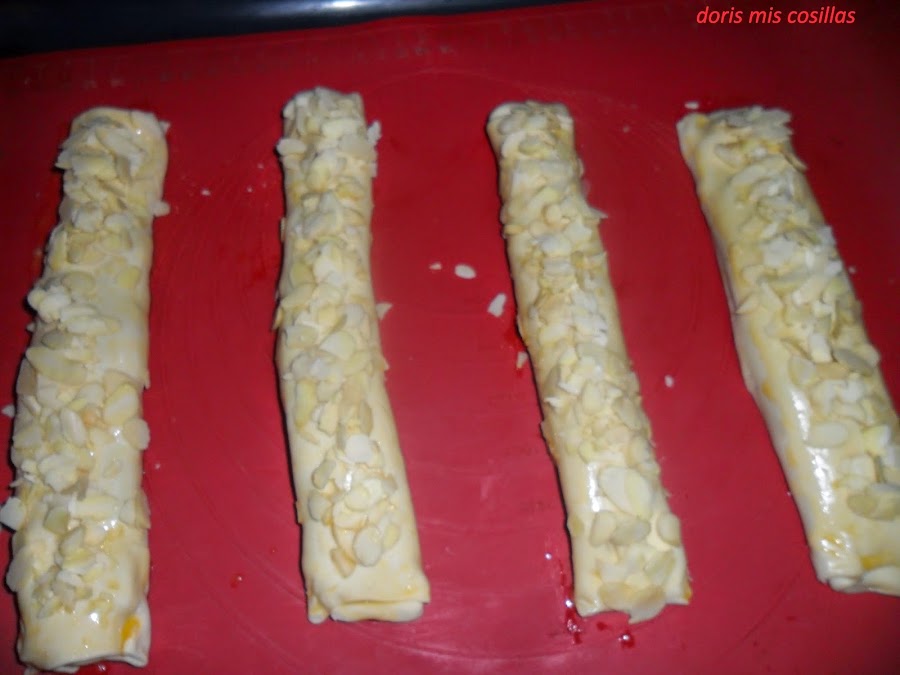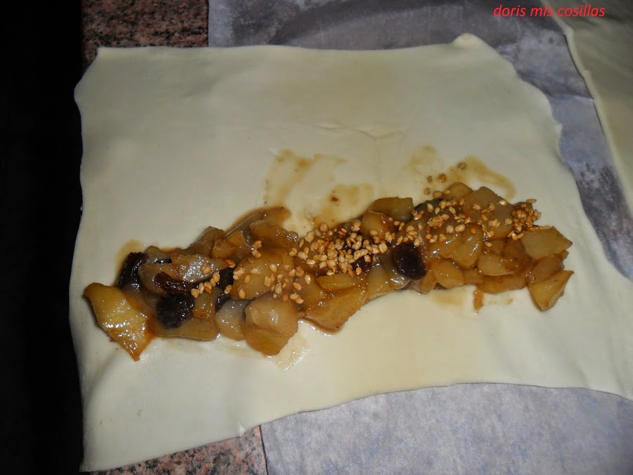 Agregar una generosa porción en cada rectángulo de hojaldre y ponemos un poco sésamo tostado.... huuuuu le da un toque delicioso.