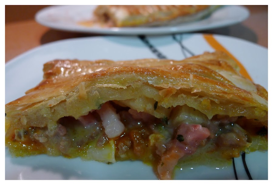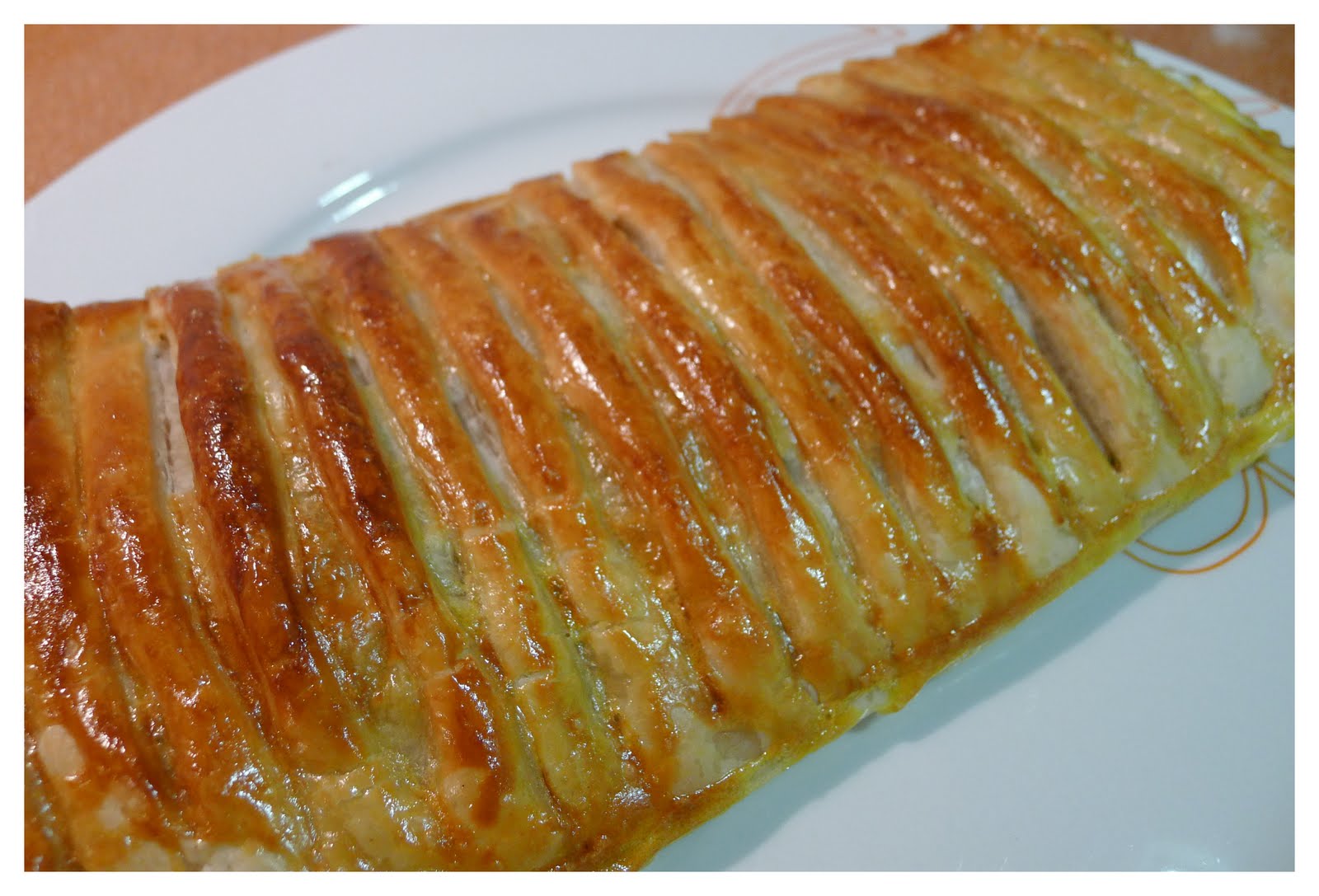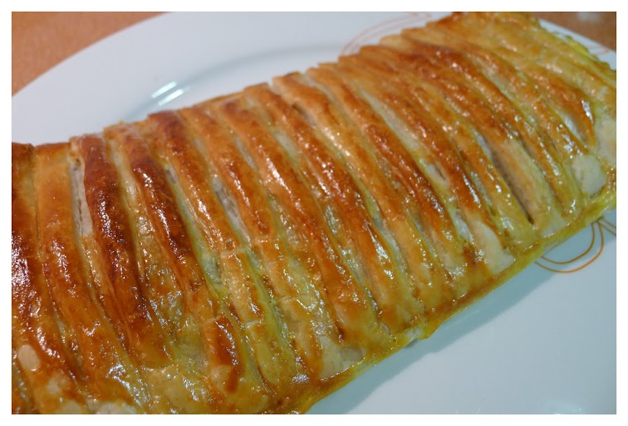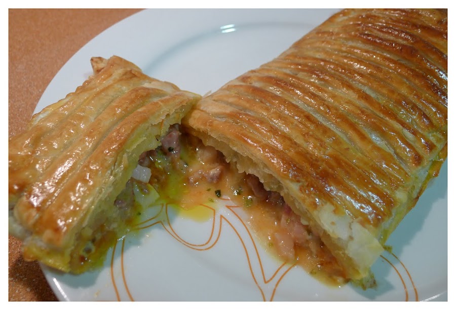 Esta es mi version de la trenza pizza de Rocio,solo que con la formita de strudel,nada mas verlo en el blog Tererecetario se me antojo hacerlo asi,queda chulo verdad? a mi me ha encantado,tanto de presencia como de sabor!!! sin duda una receta que en casa se convertira en un clasico en cenas o por ejemplo en cumples o celebraciones informales,se hace en un plis y admite todos los rellenos que se te apatezcan.yo lo rellene de carne picada,bacon,piña y roquefort,tenia ganas desde hace tiempo,pues asi y añadiendole gambitas es como yo me pedia las pizzas hace años en un lugar al que ibamos siempre! si el chico que me atendia(que ya se la sabia de memoria y le parecia la combinacion mas rara del mundo) lee esto sabra quien soy fijo jajaja