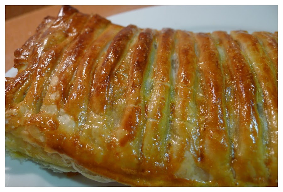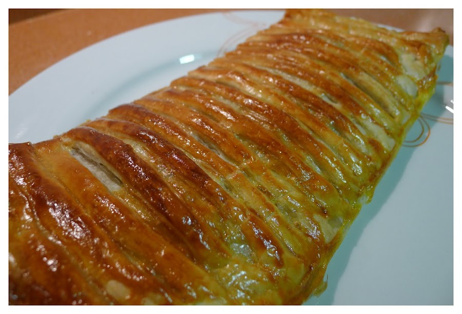 Estiramos la masa de hojaldre y sobre el centro de la masa,poniendola en vertical,disponemos el relleno.