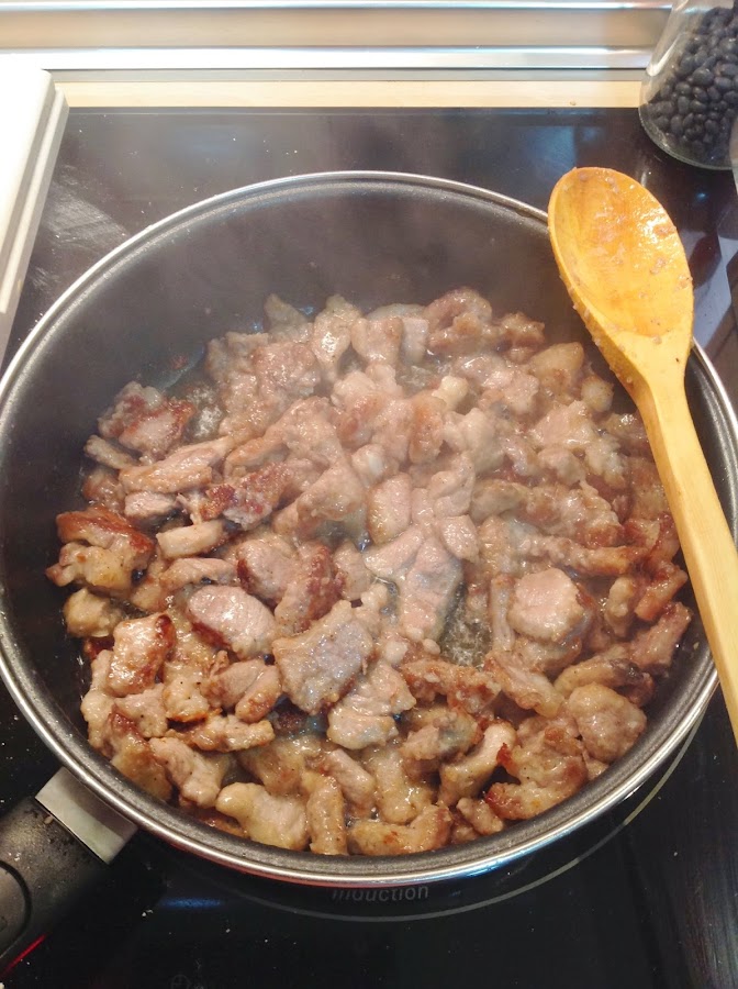 Sacamos la carne de la sartén y la separamos de los huesos, si los hubiera. Quitamos también el laurel y las pimientas.