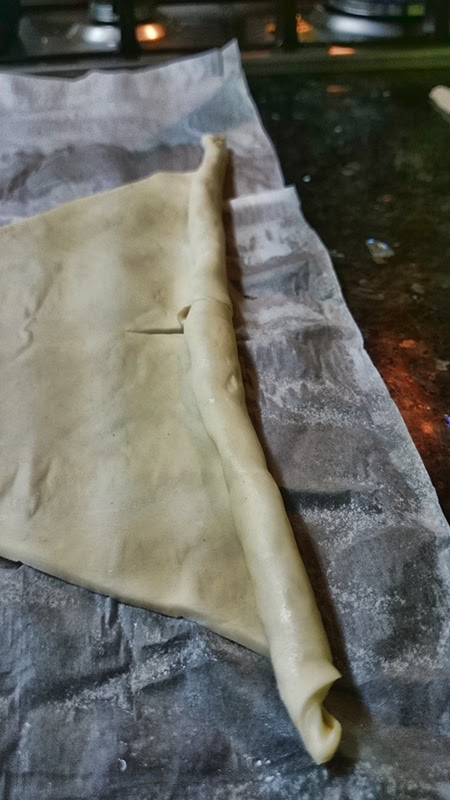 Ahora le haremos un corte en la parte ancha (en la punta no), y cogiendo los dos lados empezaremos a enrollar hacia abajo. La forma acaba saliendo sola, veréis que el centro os queda un poco más gordo.