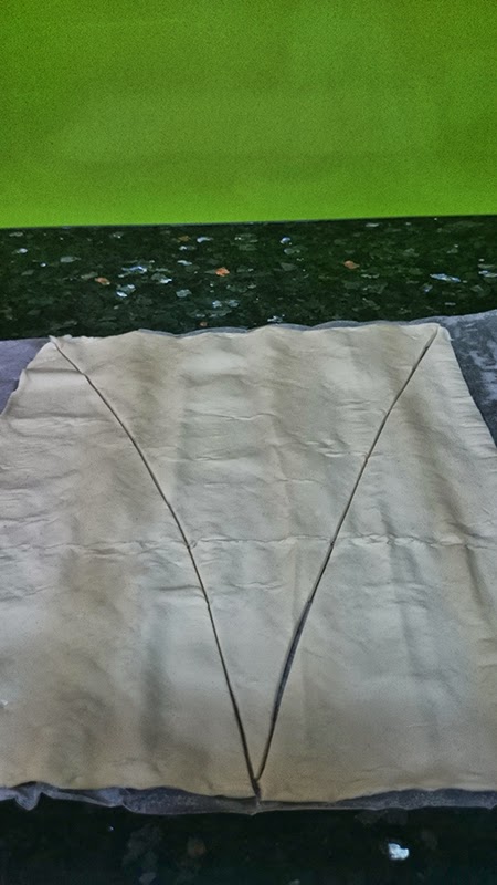 Estiraremos la masa de hojaldre y la cortaremos dando forma de triangulo.