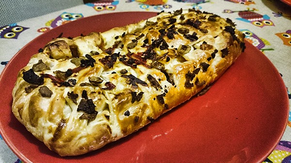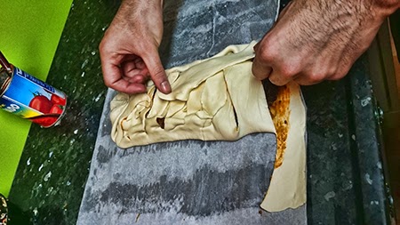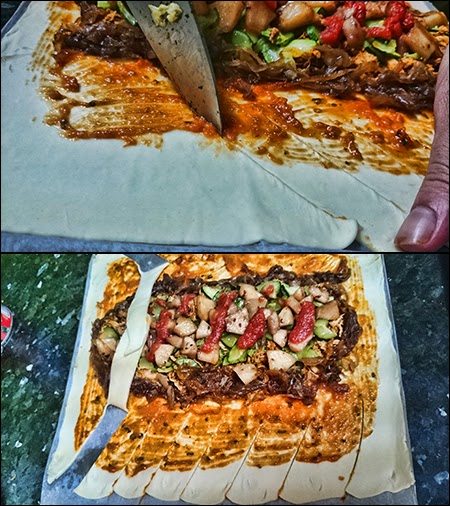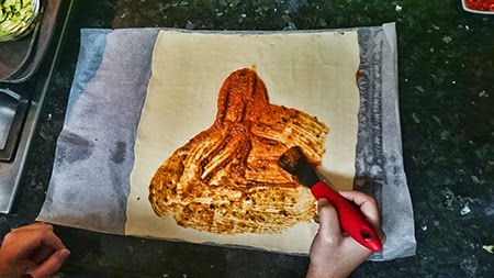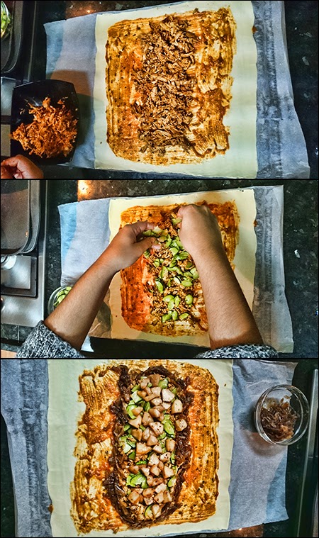 Cogemos la masa y la estiramos. Pintamos con la salsa de tomate y vamos haciendo capas, primero la carne desmechada, luego el calabacín, la manzana, la cebolla y por último otra pequeña pincelada de tomate.