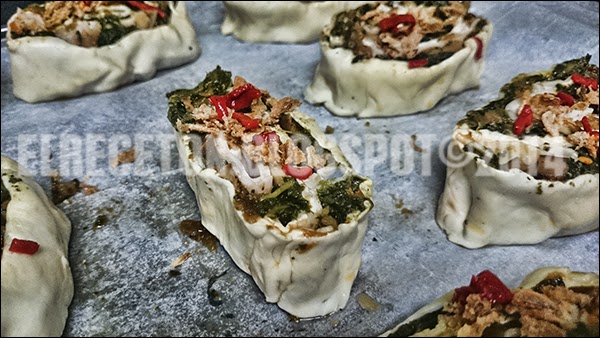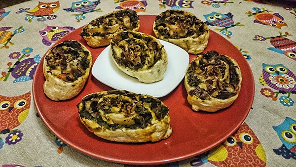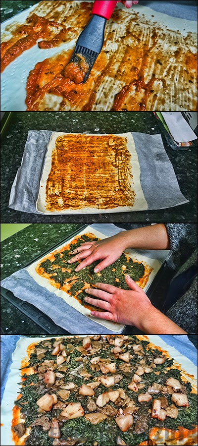 Pintamos el fondo con la salsa de tomate y añadimos las espinacas, la manzana, los níscalos y la cebolla.