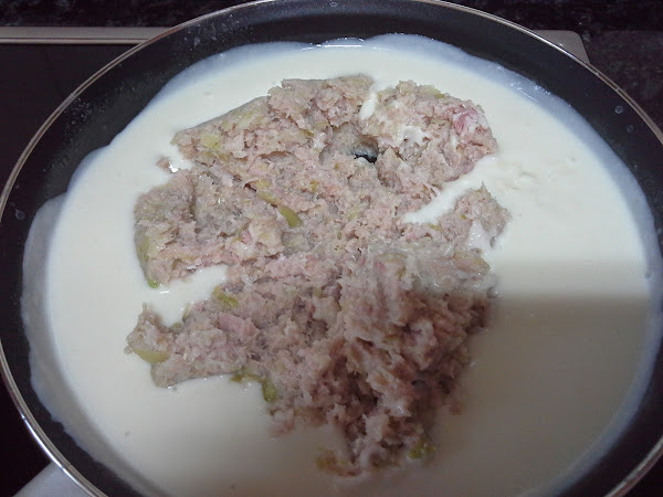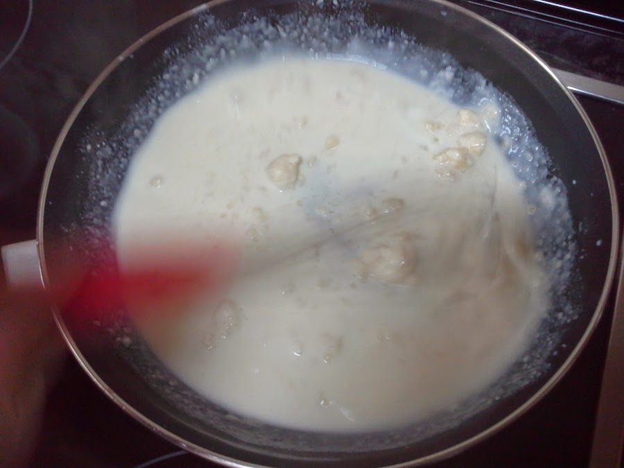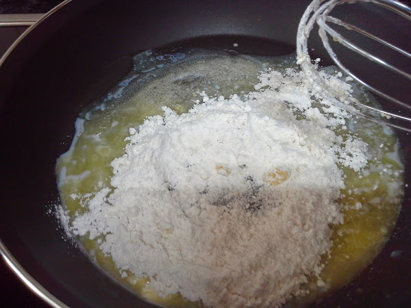 En una sartén, fundimos la mantequilla a fuego medio. Añadimos la harina y rehogamos hasta que esté doradita. Vertemos la leche lentamente y removemos para no formar grumos.