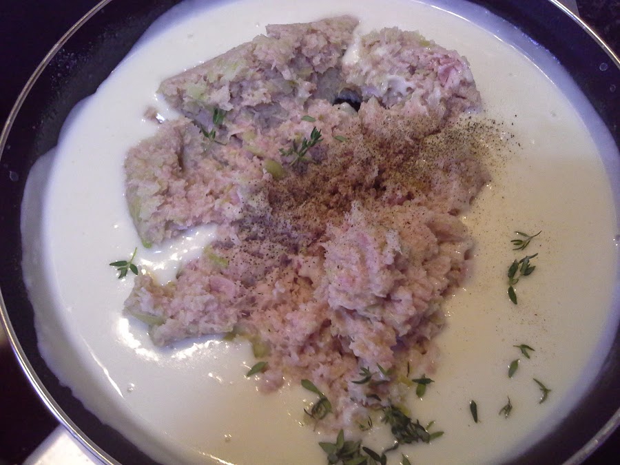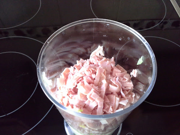 Cortamos el jamón muy fino. En un vaso batidor, trituramos con el puerro. A continuación, añadimos el puré a la bechamel. Salpimentamos y añadimos el tomillo deshojado.