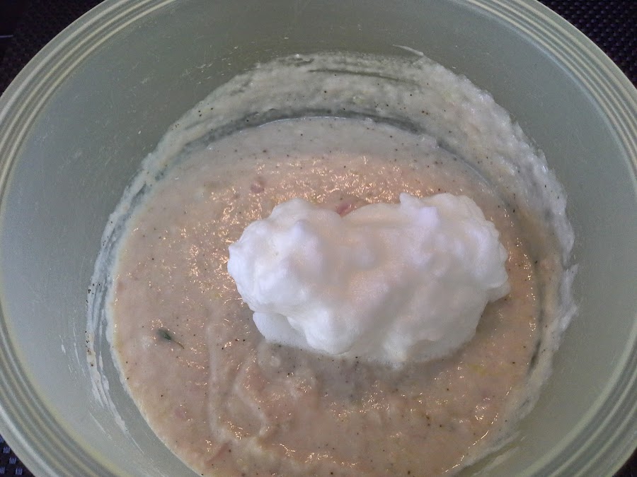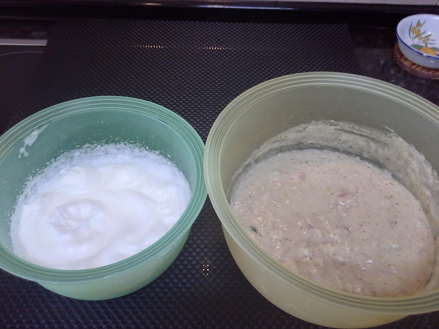 Montamos las claras a punto de nieve y mezclamos al puré con movimientos envolventes.