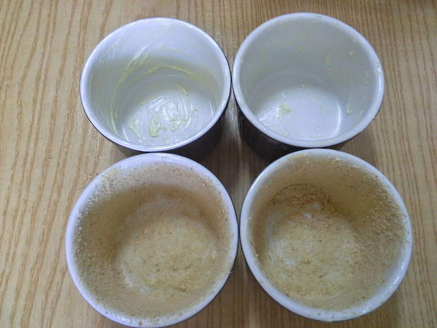 Engrasamos los moldes con aceite o mantequilla y espolvoreamos el fondo y las paredes con pan rallado.