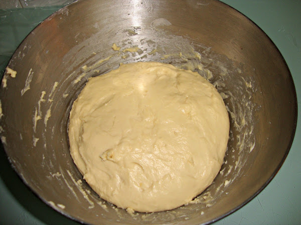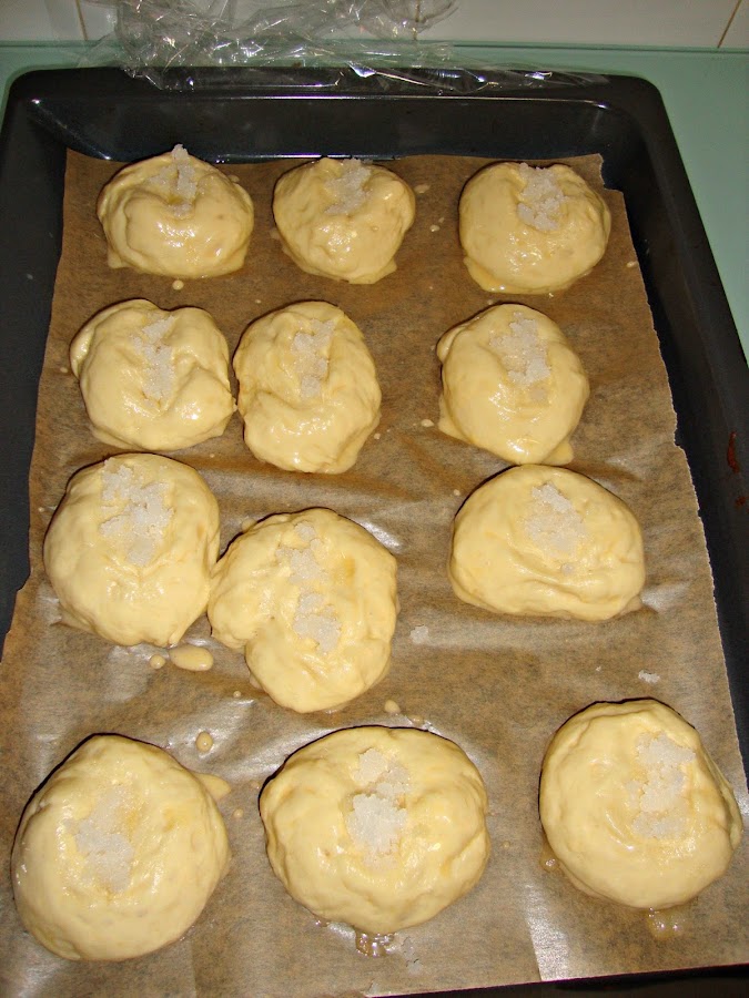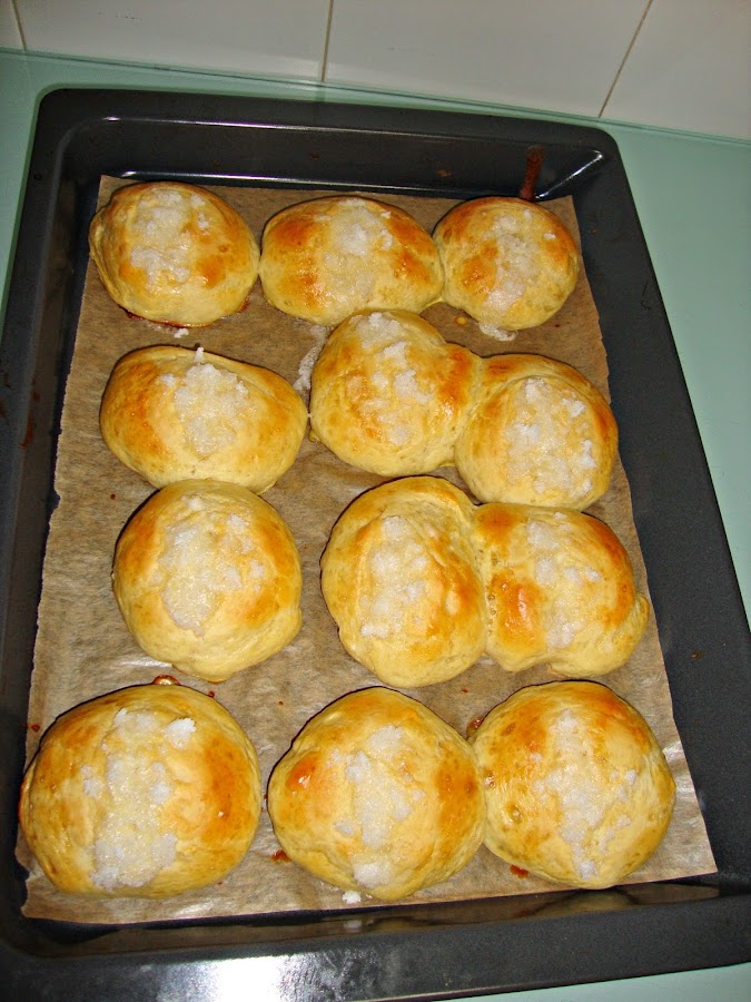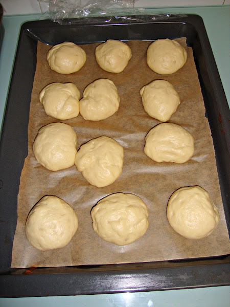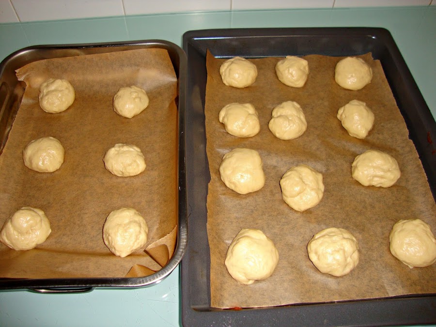 (yo puse 12 bollitos en la bandeja y entre el levado y luego el horno se acabaron pegando unos a otros, es mejor poner solo 9 unidades)