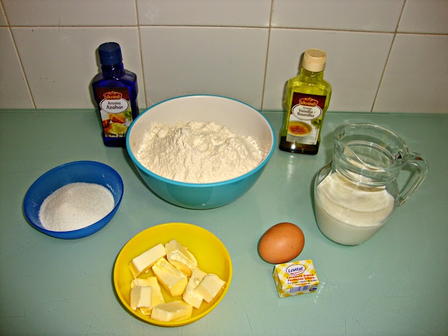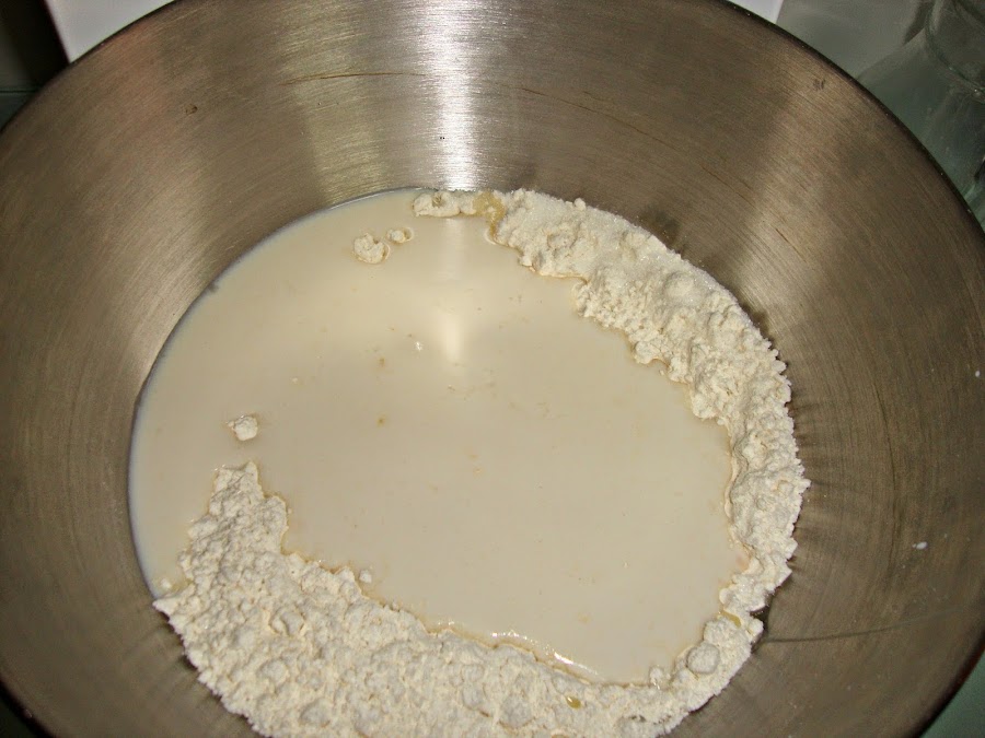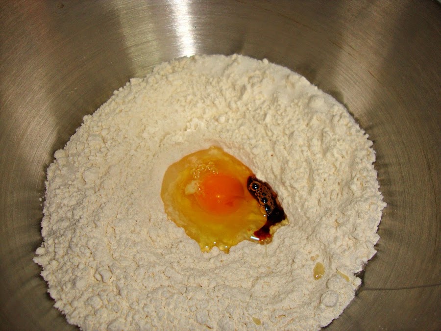 En un bol ponemos el azúcar con la harina, hacemos un agujero en el centro y añadimos el huevo, las esencias y la leche tibia.