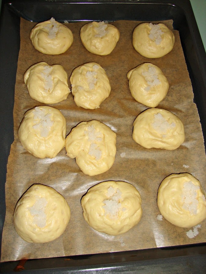 Hacemos un corte en el centro de cada bollito y le ponemos un poco de azúcar, luego los pintamos con huevo batido al que hemos echado una cucharada de leche (así quedan mas dorados y no se queman).