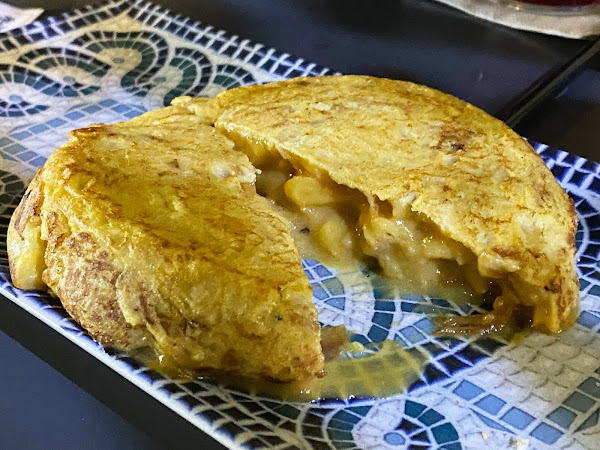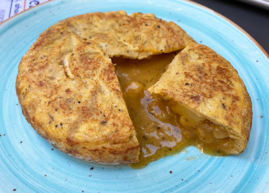 Uno de sus platos estrella por excelencia es la tortilla de patata, tanto la clásica como la que tiene trufa, ambas nos parecieron espectaculares, poco cuajadas y jugosísimas. La versión clásica tiene cebolla caramelizada y es un espectáculo.