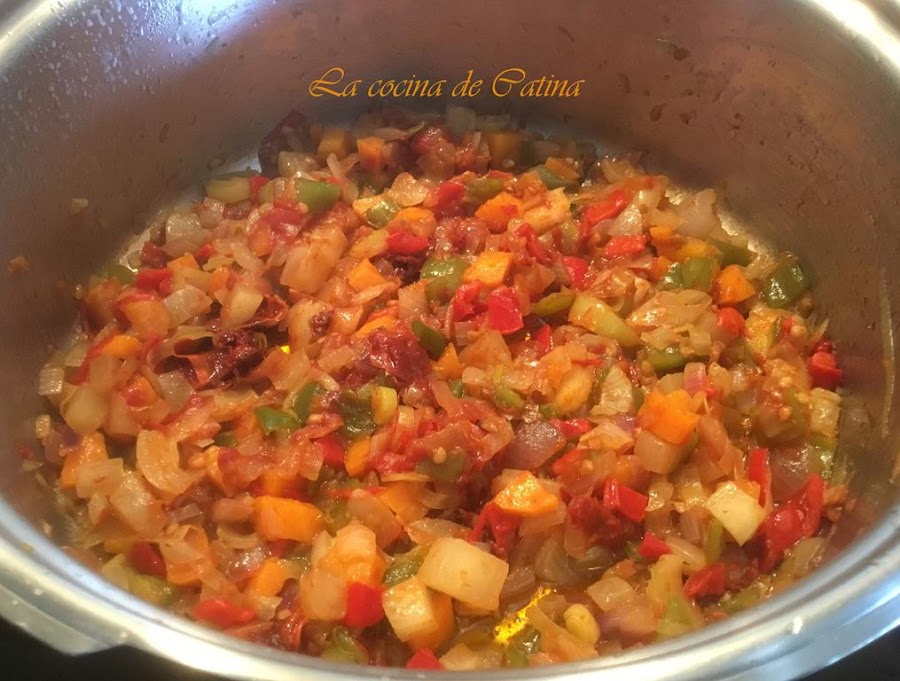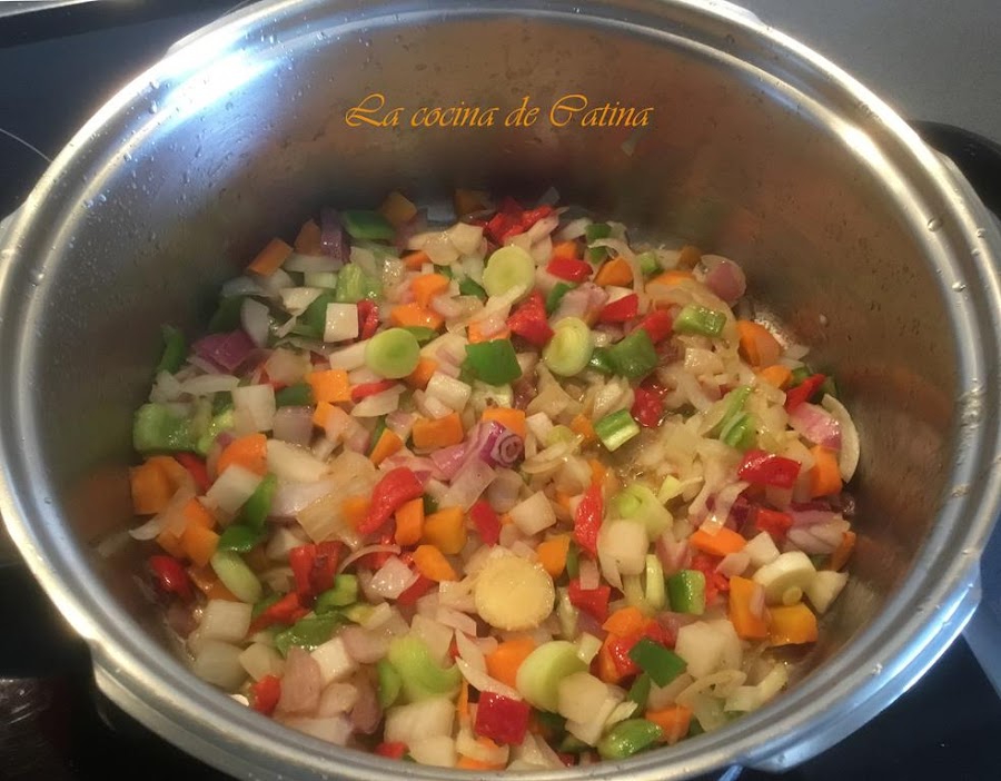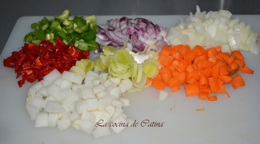 Picamos la cebolla, la zanahoria, el puerro, el nabo, los pimientos y el perejil. En la misma cazuela que hemos sofrito la carne, pochamos las verduras durante 15 minutos, añadimos el tomate rallado y seguimos friendo 15 minutos más a fuego lento.