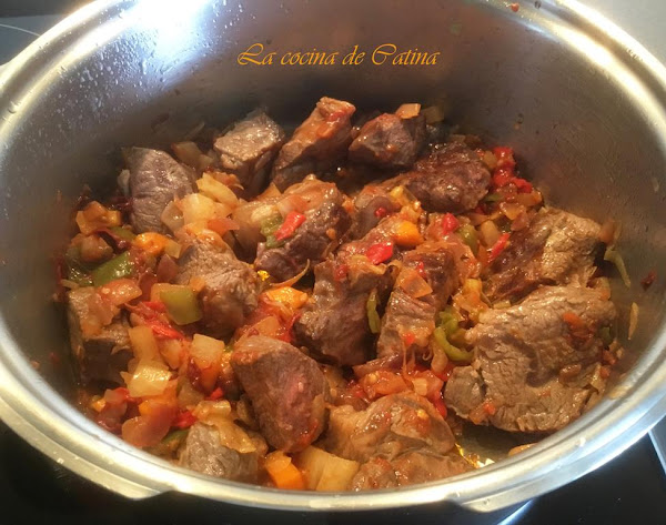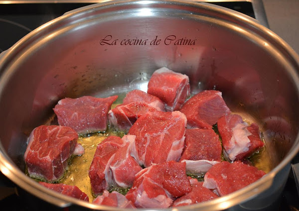 Troceamos la carne en trozos grandes. ponemos la olla rápida al fuego con el aceite a calentar. Salamos los trozos de carne y sofreírlos, una vez sofrita la sacamos y reservamos.