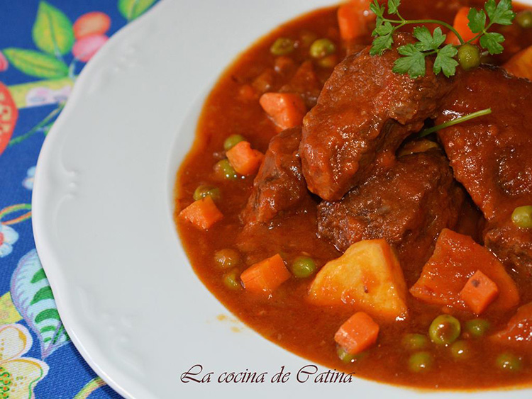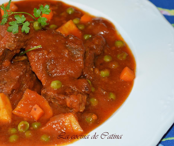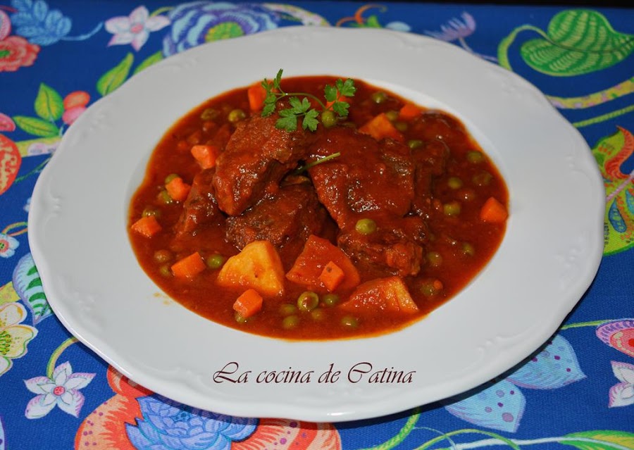 Una vez que podamos abrir la olla, sacamos los trozos de carne y trituramos toda la salsa, volvemos a introducir la carne en la olla, añadimos las patatas y los guisantes y si es necesario añadimos un poco más de caldo. Cocemos 5 minutos más.