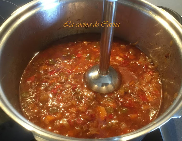 Incorporamos el concentrado de tomate y la pulpa del pimiento choricero, mezclamos bien todo este sofrito. Añadimos el caldo, el vino y los trozos de carne que teníamos reservados. La carne debe quedar cubierta con el caldo. Rectificamos de sal.