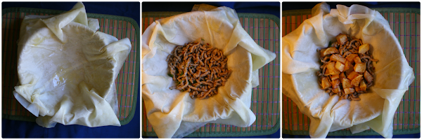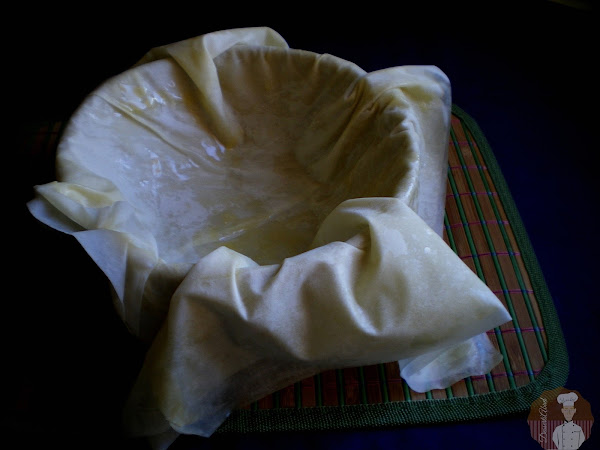 Superponer dos láminas de pasta filo una vez enbadurnadas con la margarina sobre el interior del cuenco.