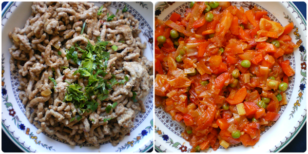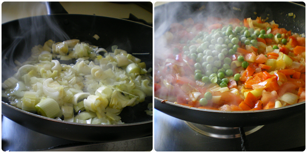 En una sartén mediana, poner 1 cucharada de aceite de oliva y otra de margarina. Cuando ésta se haya derretido, añadir los dientes de ajo, la cebolla y el puerro. Sofreír durante 5-7 minutos. Añadir a continuación la zanahoria, el pimiento rojo, los guisantes y el tomate. Saltear durante unos 3 minutos y a continuación, incorporar 1 cucharada de tomate concentrado. Remover, apartar a un plato y reservar.