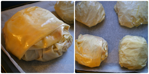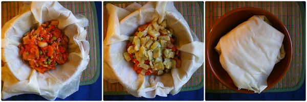 Poner por este orden los rellenos: carne picada, patatas fritas, verduras y para finalizar, las berenjenas. Plegar la pasta filo sobre sí y llevar a una fuente de horno. Poner el Sultan kebabı con la parte plegada sobre la bandeja para evitar que se nos salga el relleno.