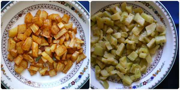 ✓ Pelar las patatas y cortarlas igualmente en cuadrados del mismo tamaño.