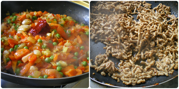 En esa misma sartén, poner un poquito más de aceite y dorar la carne picada con un poco de sal y una cucharadita de especias.