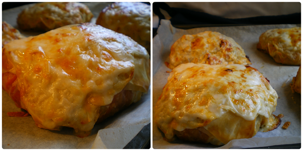 Distribuir la bechamel sobre cada porción y sobre ella el queso rallado.